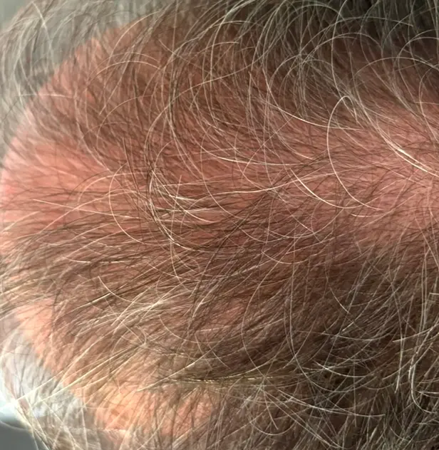 Przerzedzenie zlokalizowane głównie na szczycie głowy (vertex), typowe dla męskiego łysienia androgenowego. Efekt: Zastosowane działania odwróciły proces osłabienia włosa. Uzyskano znaczne pokrycie skóry głowy w strefie korony i wizualne zagęszczenie fryzury.