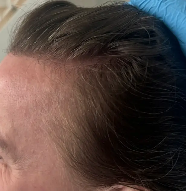 Przerzedzenie widoczne w kątach czołowych (zakola) oraz wzdłuż linii czołowo-skroniowej, skutkujące dużą ekspozycją skóry głowy.Efekt: Widoczne zagęszczenie i pogrubienie włosów w strefie przyczołowej. Uzyskano lepsze pokrycie skóry w obszarze skroni oraz optyczne wyrównanie i zagęszczenie linii fryzury.