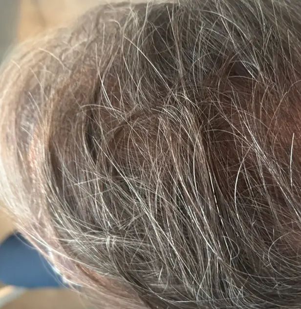 Przerzedzenie w obszarze szczytu głowy. Efekt: Widoczne zagęszczenie na samym czubku. Włosy są gęstsze i mają bardziej nasycony kolor, co znacząco poprawiło krycie skóry w tym obszarze.