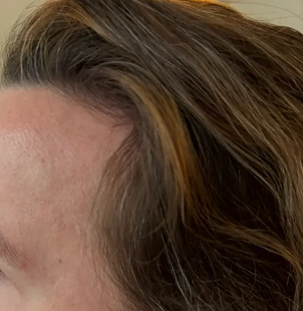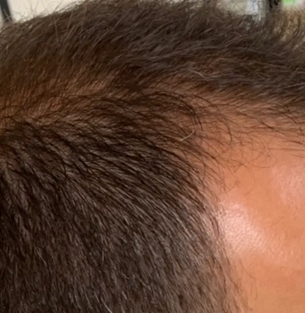 Przerzedzenie widoczne w kątach czołowych (zakola) oraz wzdłuż linii czołowo-skroniowej, skutkujące dużą ekspozycją skóry głowy.Efekt: Widoczne zagęszczenie i pogrubienie włosów w strefie przyczołowej. Uzyskano lepsze pokrycie skóry w obszarze skroni oraz optyczne wyrównanie i zagęszczenie linii fryzury.