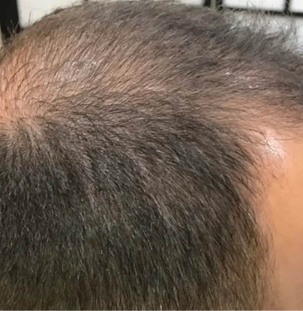 Przerzedzenie zlokalizowane głównie na szczycie głowy (vertex), typowe dla męskiego łysienia androgenowego. Efekt: Zastosowane działania odwróciły proces osłabienia włosa. Uzyskano znaczne pokrycie skóry głowy w strefie korony i wizualne zagęszczenie fryzury.